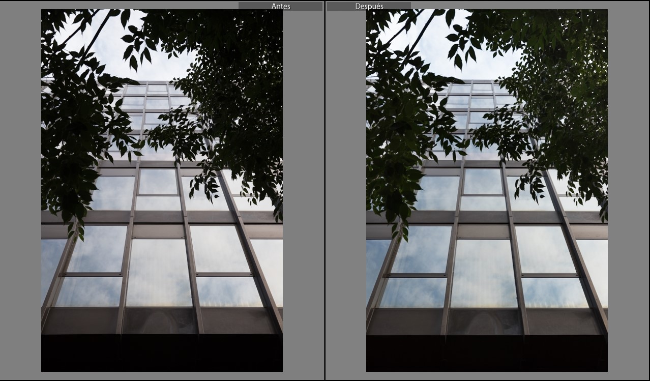No hay mucho problema en recuperar zonas azules del cielo en el reflejo de la fachada. Como en la miniatura no se aprecia tanto la recuperación de sombras de la parte de las hojas, aquí hay una comparación al 100%.