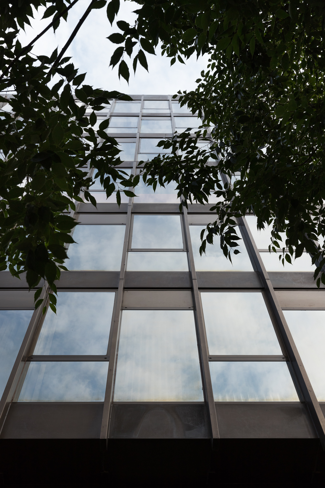 El reflejo de un cielo casi blanco en un edificio con una fachada de cristal y los árboles a contraluz. Un buen sitio para ver qué tal anda la nueva EOS 6D Mark II de rango dinámico.